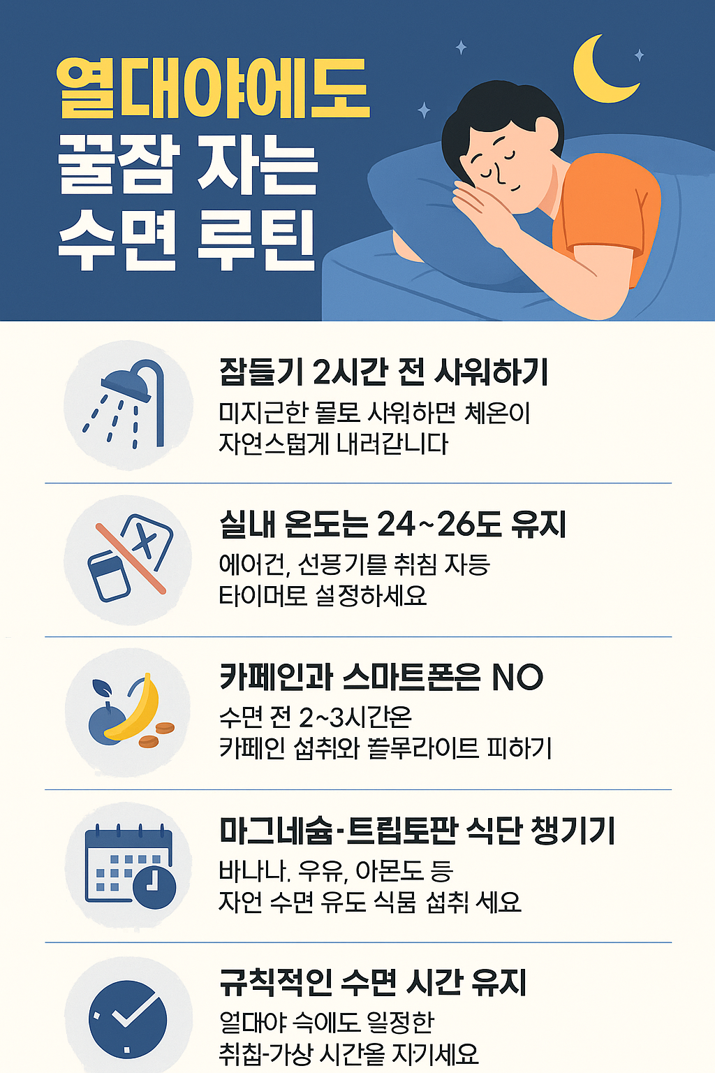 열대야는 피할 수 없어도, 숙면은 만들 수 있어요! 습관만 조금 바꾸면 건강한 여름밤이 가능합니다 🌙