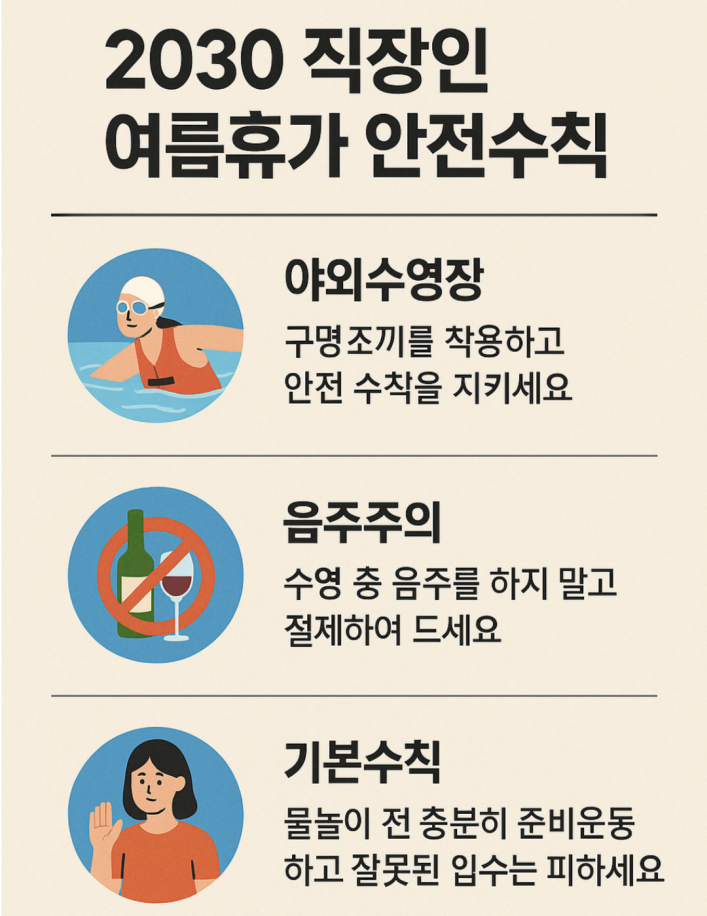 여름휴가 시즌이 되면 많은 2030 직장인들이 스트레스를 날리기 위해 수영장을 찾습니다. 하지만 휴식과 즐거움만 생각하다 보면 안전에 소홀해질 수 있습니다. 특히 야외수영장은 다양한 위험 요소가 숨어 있어 사고로 이어지기 쉽습니다. 이번 글에서는 2030 직장인들을 위한 야외수영장 안전수칙, 음주 후 수영의 위험성, 기본적으로 지켜야 할 안전 규칙 등을 자세히 안내드리겠습니다.